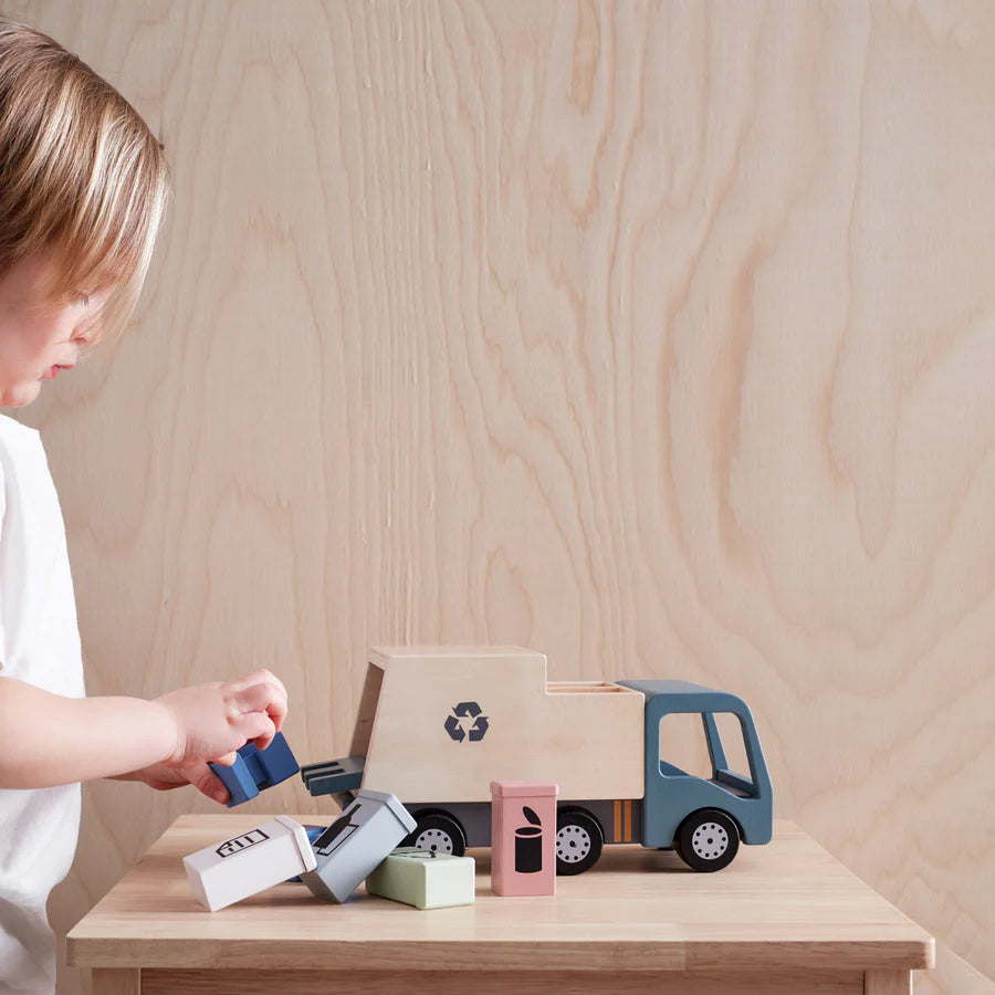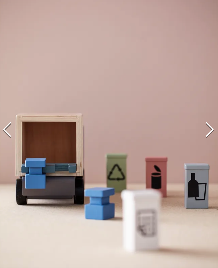 Time to recycle! Wooden garbage truck with four sorting bins for recycling. The bins can be placed on the lift at the back and lifted up into the truck.